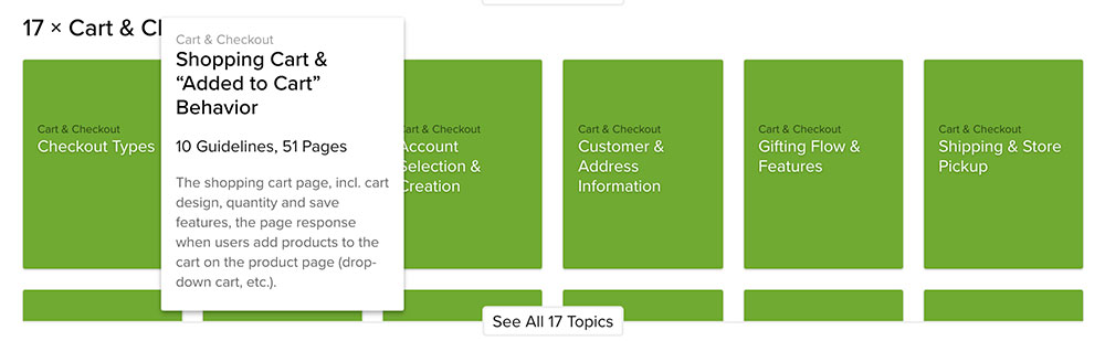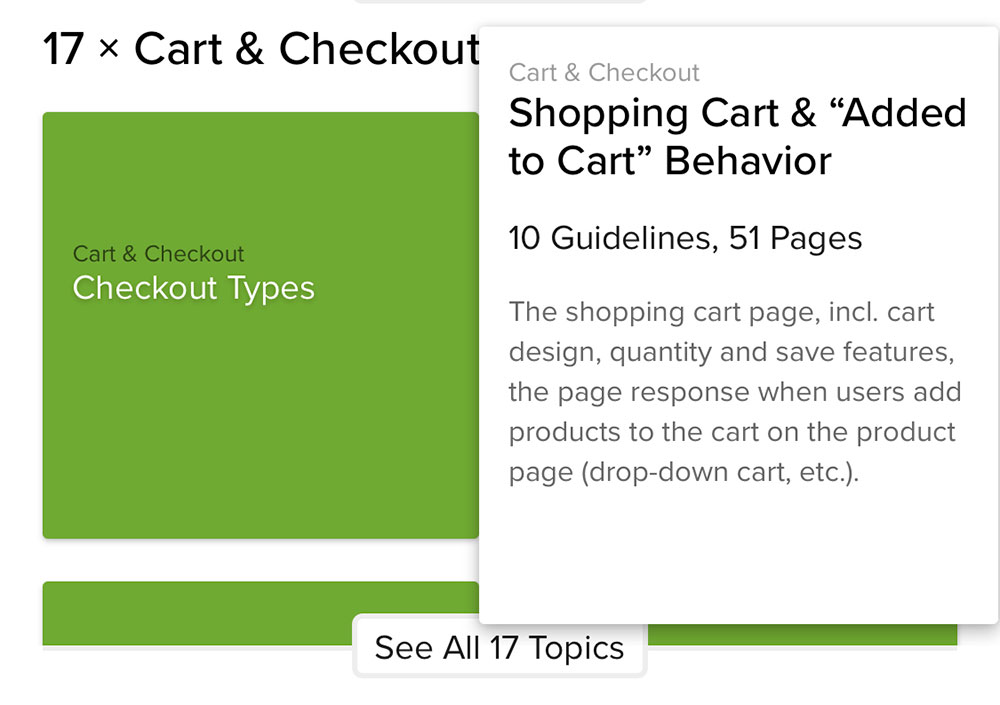 The second example is the Baymard Institute. The tiles that the users encounter first, give a rough overview of the topics. When hovering over one of these tiles, more information is provided within an extra layer.