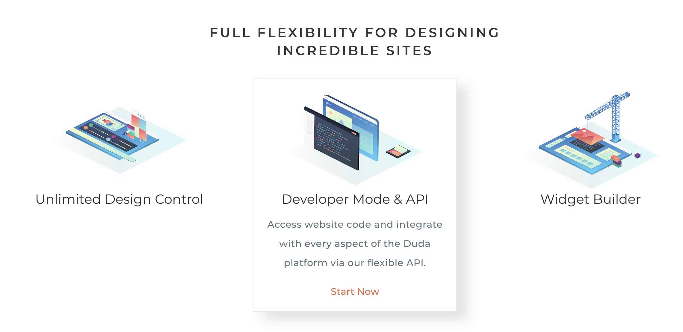 The first example is Duda. Nice and bold illustrations and crisp copy allow for quickly scanning the content to get an overview.
