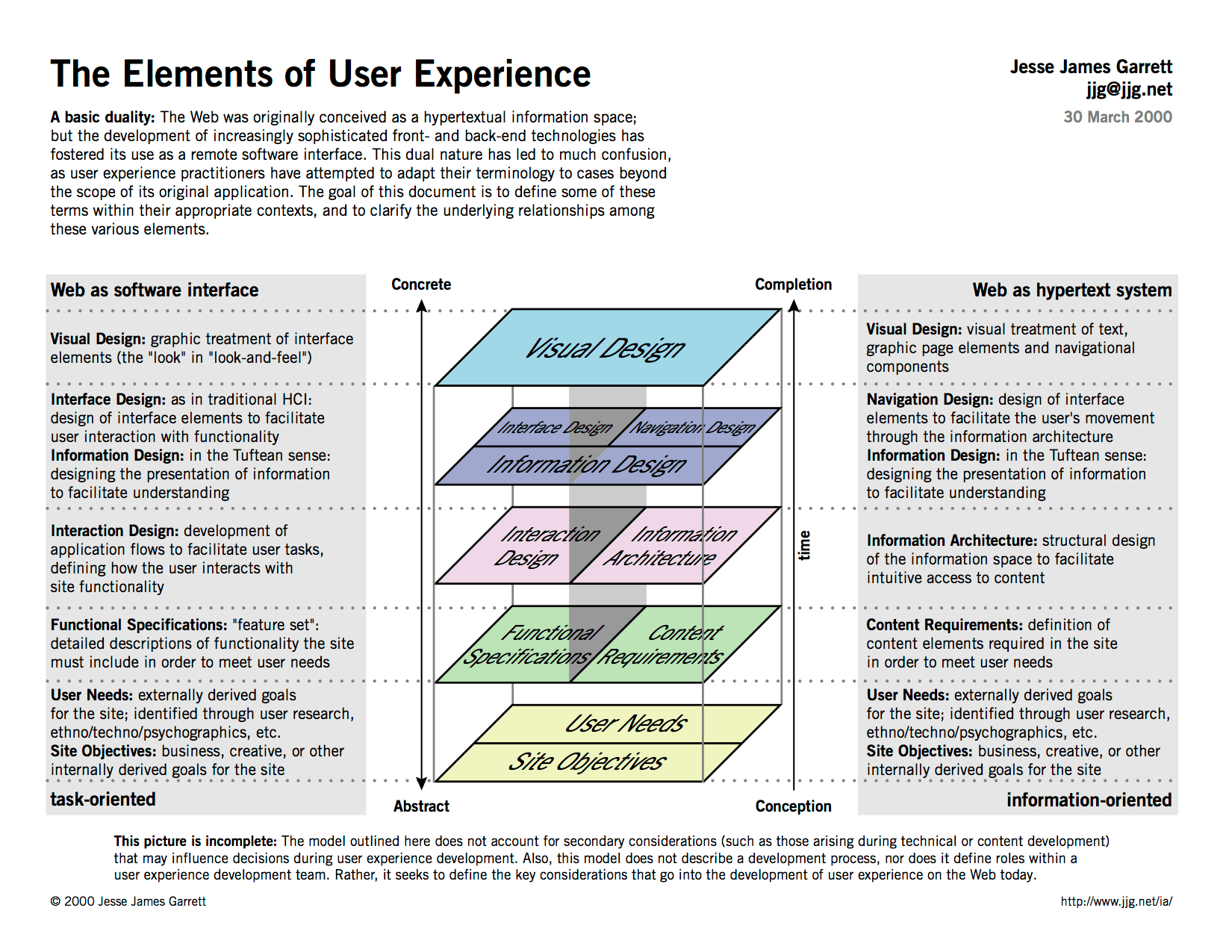 Back in the year 2000 Jesse James Garrett gave us a more detailed view to the elements of UX. Going from abstract/concept to concrete/completion.
