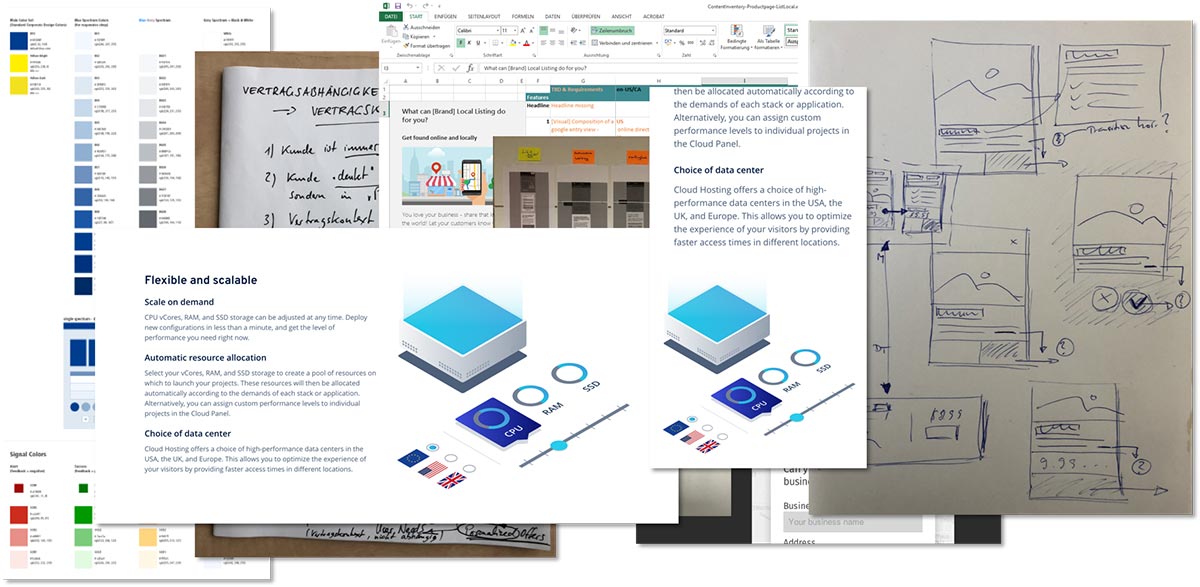 Closing with a little composition of UX artifacts we’ve produced in a recent project: data excels, scribbles, wireframes (hang on walls), content inventory in excel (including wireframes for giving context), etc. to the finished responsive website.